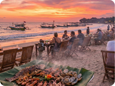 Jimbaran Sunset & Seafood Dinner Area: Enjoy a relaxed sunset atmosphere by the beach, famous for fresh seafood restaurants (Dinner by own expenses)